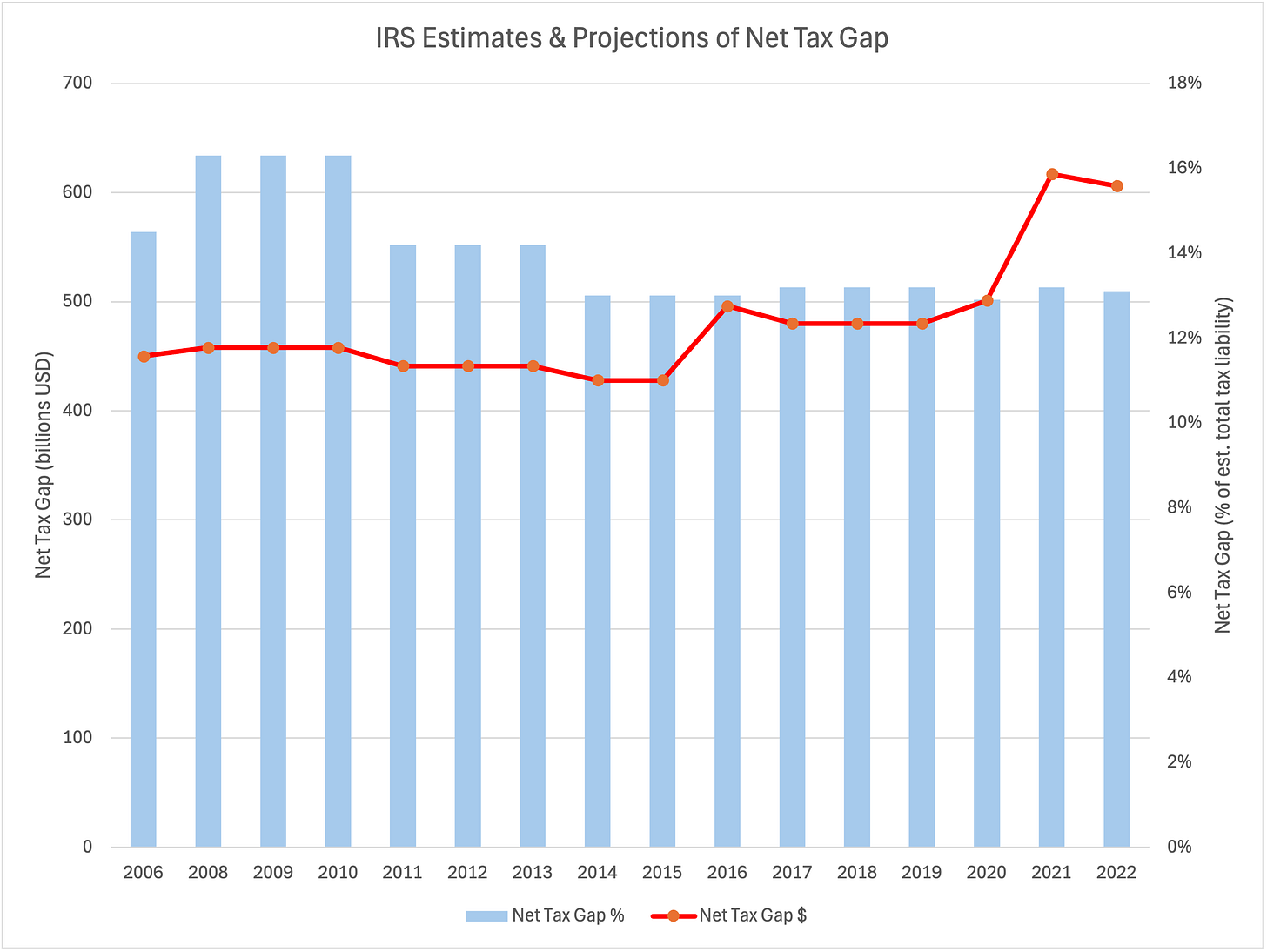 The IRS regularly publishes their own estimates and projections of the tax gap—the difference between the amount of taxes legally owed and the amount collected—and finds that anywhere from 10-12% of taxes are not collected, an estimated $600 billion in 2022. In fiscal terms this is a bit more than just a free lunch. If this $600 billion tax gap was collected as owed it would have closed nearly half of the 2022 budget’s $1.4 trillion deficit.