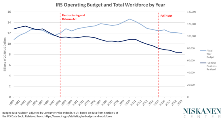 The IRS as an agency has been neglected since long before Trump’s attacks began. Before the COVID pandemic; funding had been on the decline for a decade and the workforce followed suit. In 2014 the IRS Advisory Council stated that the agency was “in the midst of an existential funding crisis.” Its budget then decreased for five straight years. This decline was briefly interrupted by President Biden’s Inflation Reduction Act, which allocated $80 billion over ten years to the agency, but subsequent legislation and executive action has more than undone these increases.