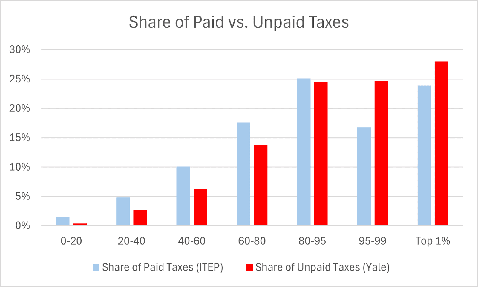 Tax evasion does not merely follow the same progressive distribution as taxes paid. The top 1% of income earners make up almost 30% of unpaid taxes, as compared to roughly 24% of all taxes paid. The following is a chart comparing the Institute on Taxation and Economic Policy’s estimates for share of taxes paid to the Yale Budget Lab’s estimates for share of unpaid taxes. (Note that ITEP’s estimates are for 2024 and Yale’s are for 2025, but year-to-year differences are unlikely to be significant.)