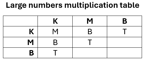 Here are two ways we might train our minds to do this arithmetic. One is to memorize the six possible division problems. Let’s use T for trillion, B for billion, M for million, and K for thousand, as is often done. A trillion divided by a billion is a thousand: T ÷ B = K. A trillion divided by a million is a million: T ÷ M = M. And a trillion divided by a thousand is a billion: T ÷ K = B. Then, a billion divided by a million is a thousand: B ÷ M = K. And a billion divided by a thousand is a million: B ÷ K = M. Finally, a million divided by a thousand is a thousand: M ÷ K = K.