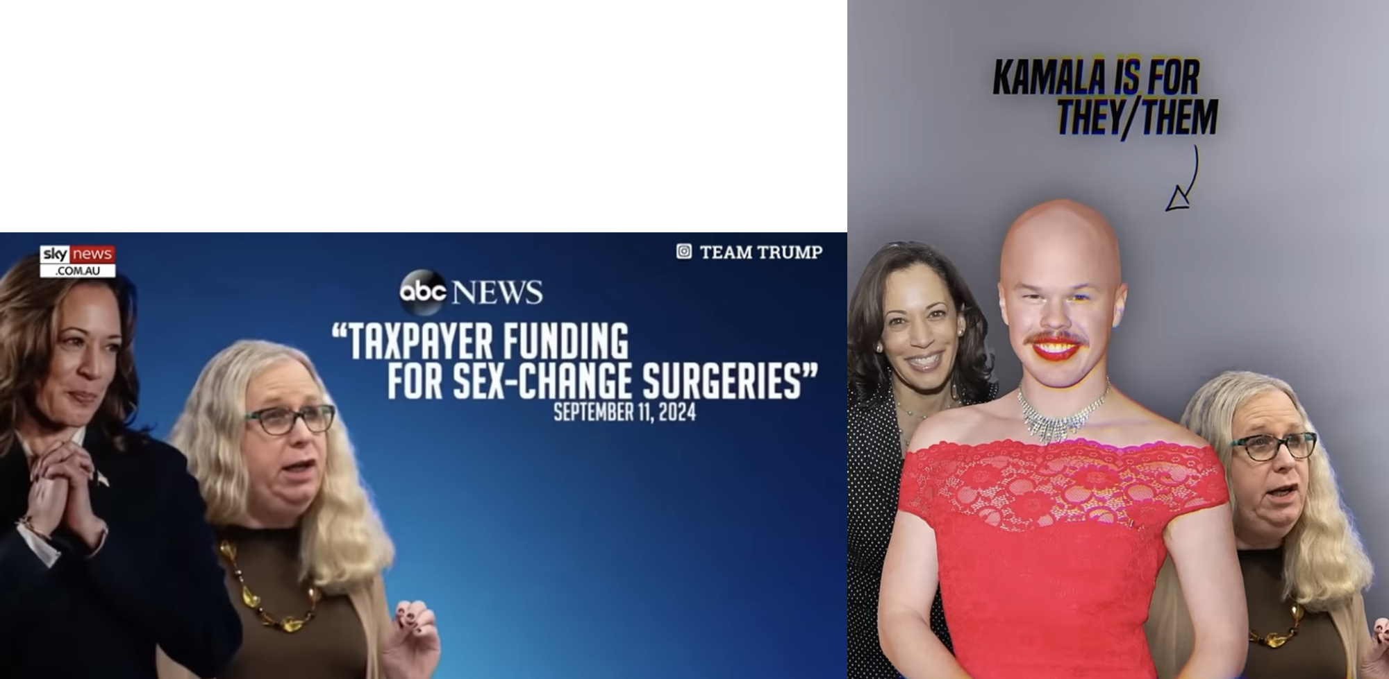 The text of the ads are about incarcerated trans people and kids playing sports, but most of the imagery was made of photos of Harris, Assistant HHS Secretary Dr. Rachel Levine (confirmed by Congress), and former deputy Assistant Secretary of Spent Fuel and Waste Disposition Sam Brinton (hired by Department of Energy and fired after they were convicted of luggage theft). Levine is a transgender woman and Brinton is gender-fluid. Despite not having worked in the administration for two years, Brinton’s photos are constantly being shared by the far right as evidence for how weird and gross the Democrats are. The subtext is clear: trans people’s mere existence in the government is intolerable.