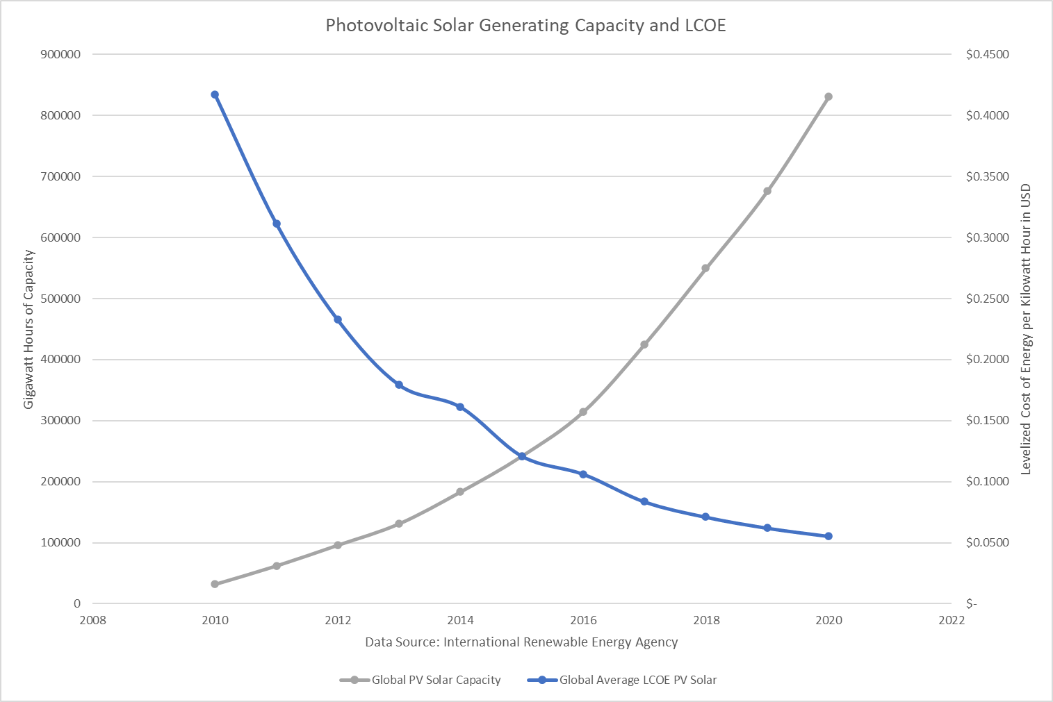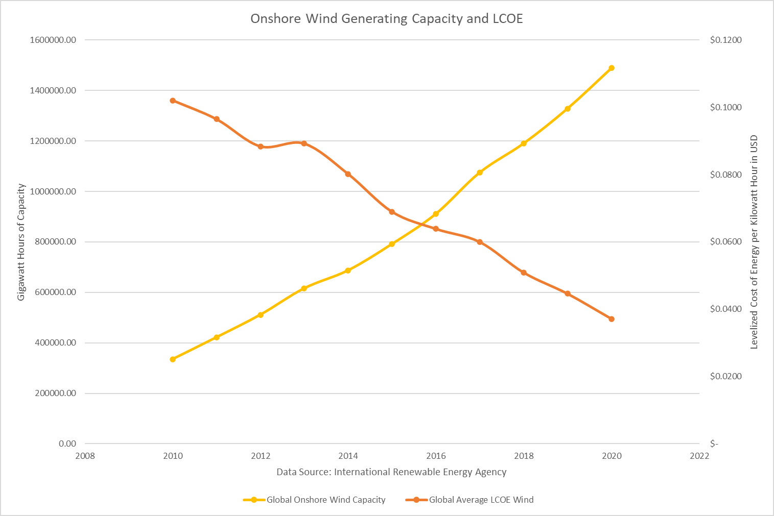 In the realm of energy generation, the most consistent dynamics are cheaper technology which begets cheaper electricity. Since 2010, the cost of a solar panel has fallen from $2 dollars to $0.20 per watt by 2020 while the cost of land-based wind turbines have similarly plunged from $2,100 per kilowatt hour of capacity to $1,440 by 2019. Greater adoption has also led to falling energy prices, as illustrated in Figures 1 and 2 below, with the cost of electricity falling in direct proportion to how much renewable capacity has been installed.