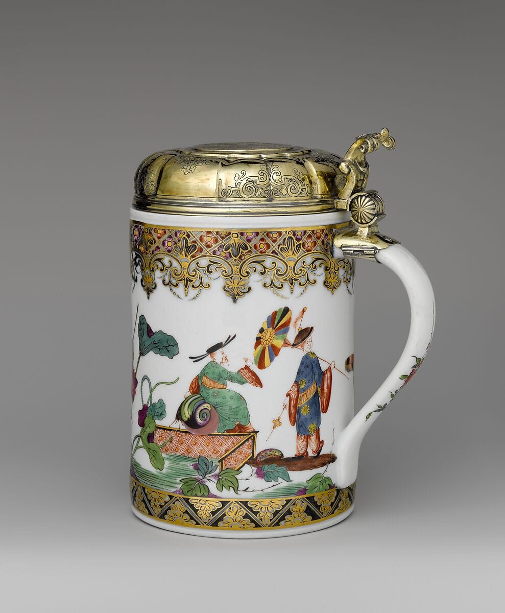 Porcelains from East Asia, like those on which this tankard was based, were just one example of ramifying international networks of commodities. During the early modern period, the consumption and use in Europe of these goods expanded. Trade in colonial goods grew faster than other imports to the German lands during the eighteenth century. In the early eighteenth century the display or commission of porcelain objects and the consumption of these foods and drinks signaled status, although they rapidly spread down the social scale. But beer was not only stereotypically northern European, its production was highly localized—it still is, in what are now Germany, Austria, and the Czech Republic. You can taste the water of a place in the beer it brews. This tankard is poised between high culture and low culture at the same time: the global and the local, the luxurious and the plebeian, the splendid and the earth. The fantasy Chinese men painted delicately on it sit amid decorative leaves which unfurl like kale.